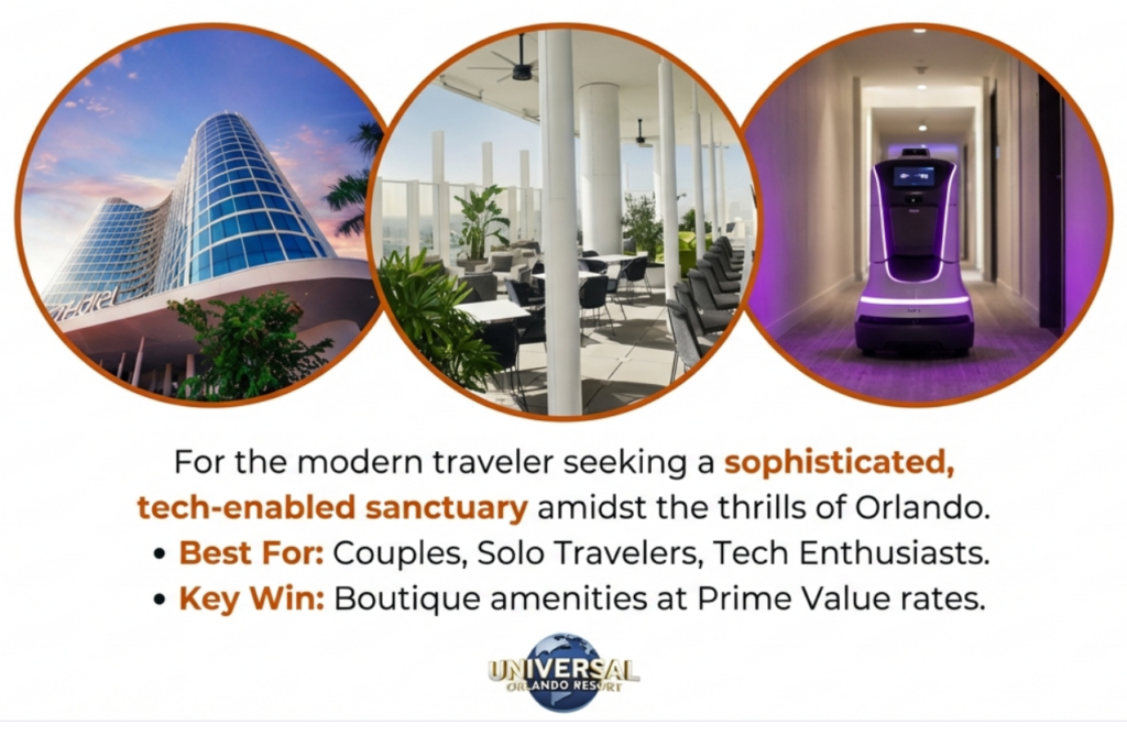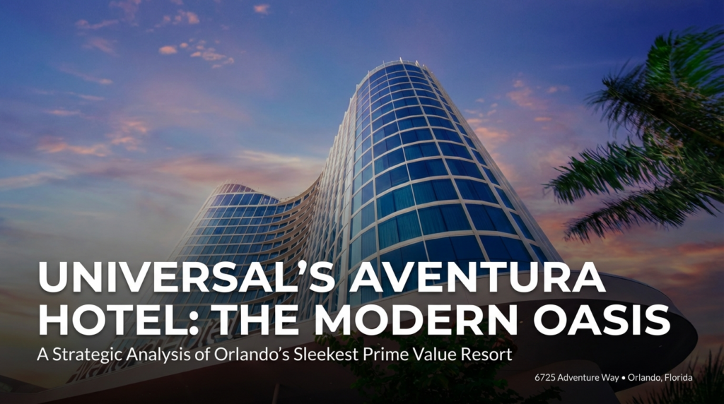 Universal’s Aventura Hotel, the sleek, 17-story glass tower that has redefined the “Prime Value” lodging category at Universal Orlando Resort. Far from the retro-nostalgia or tropical themes of its neighbors, Aventura embraces a “Simplified Style”—a minimalist, tech-forward aesthetic designed for the modern traveler seeking sophisticated comfort without the luxury price tag. This high-tech oasis uses integrated in-room tablets to put guests in total control of their environment and the hotel’s autonomous mascot, Relay the Robot, delivers essentials right to your door. Exploring the 7th floor to experience the panoramic 360-degree views at Bar 17 Bistro and discuss the logistical perks of being just a couple of minutes walk from the entrance of Volcano Bay. Whether you’re looking for an international culinary treat at the Urban Pantry food hall or a serene refuge after a day at the parks, Aventura offers an “oasis of cool calm” that makes it one of the most efficient and stylish home bases in Orlando.