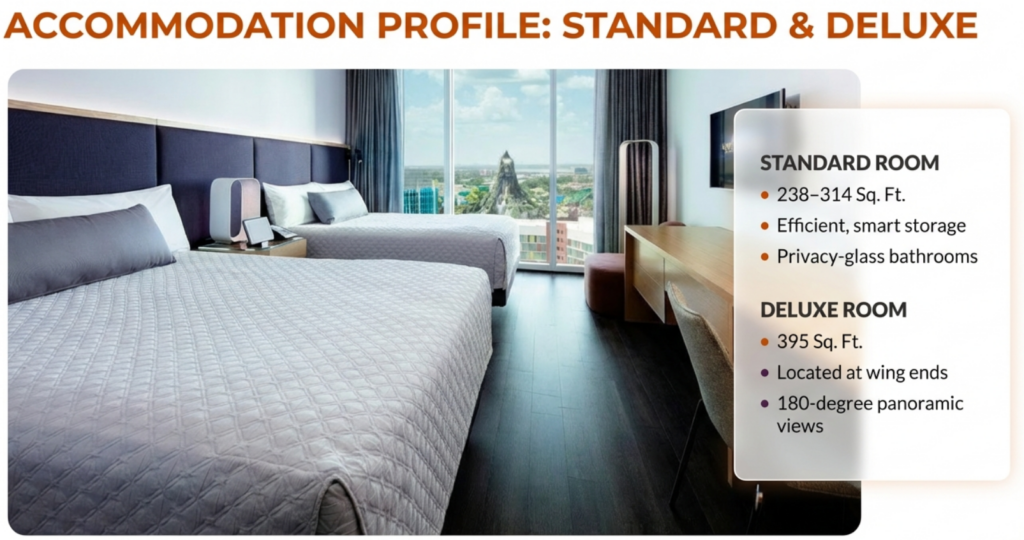 Accessibility is not restricted to a single room type; it is available across all major categories at the resort. Some rooms are designated as Mobility/Hearing Accessible, providing a comprehensive set of features such as ADA tubs alongside visual alert systems.