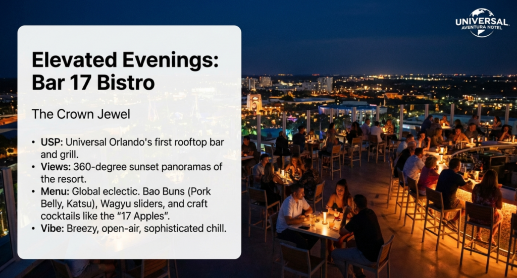 Bar 17 Bistro is Universal Orlando’s first rooftop bar and grill, located on the 17th floor of the Aventura Hotel. It is a signature feature of the resort, offering a sophisticated, open-air environment with panoramic 360-degree views of the theme parks—including a fantastic view of Volcano Bay—and the downtown Orlando skyline. Particularly popular for viewing the sunset. The bistro features an internationally inspired menu with a strong emphasis on Korean flavors and urban “small plates”.