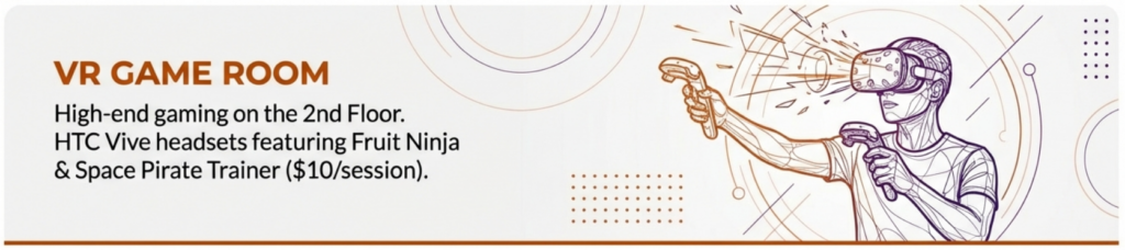 The VR game room is a high-tech recreation space, again, located on the second floor of the hotel tower. It features HTC Vive virtual reality headsets and is specifically recommended as a great indoor activity for rainy days. Game sessions typically cost $10 per 5-minute session. Guests who hold a Universal Orlando Annual Pass can receive a 50% discount on game play.